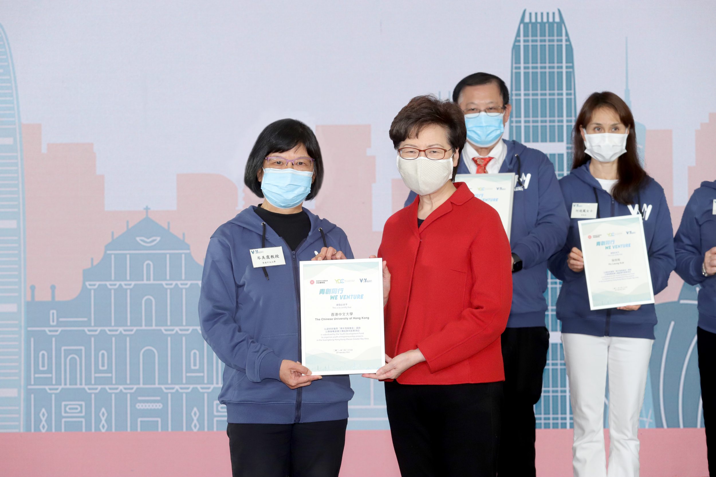 At a press conference marking the inauguration of the Scheme today (26 February), Professor Sham Mai Har, CUHK Pro-Vice-Chancellor and Vice President and Choh-Ming Li Professor of Biomedical Sciences, received a certificate from the Chief Executive Mrs. Carrie Lam Cheng Yuet-ngor in recognition of the University’s commitment to fostering youth entrepreneurship across and beyond the campus.