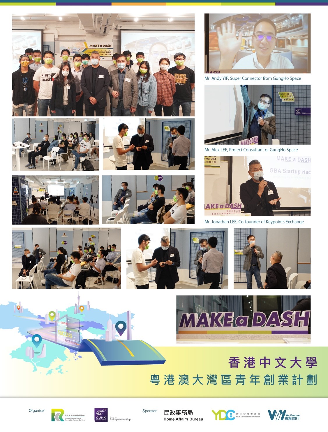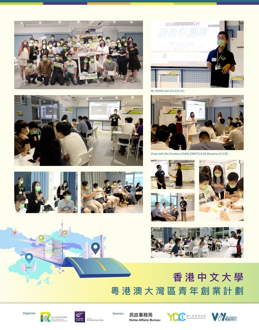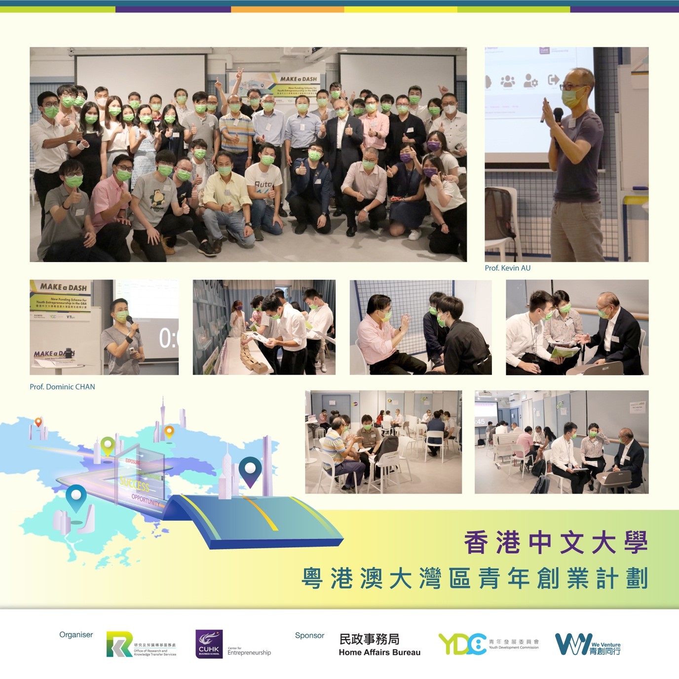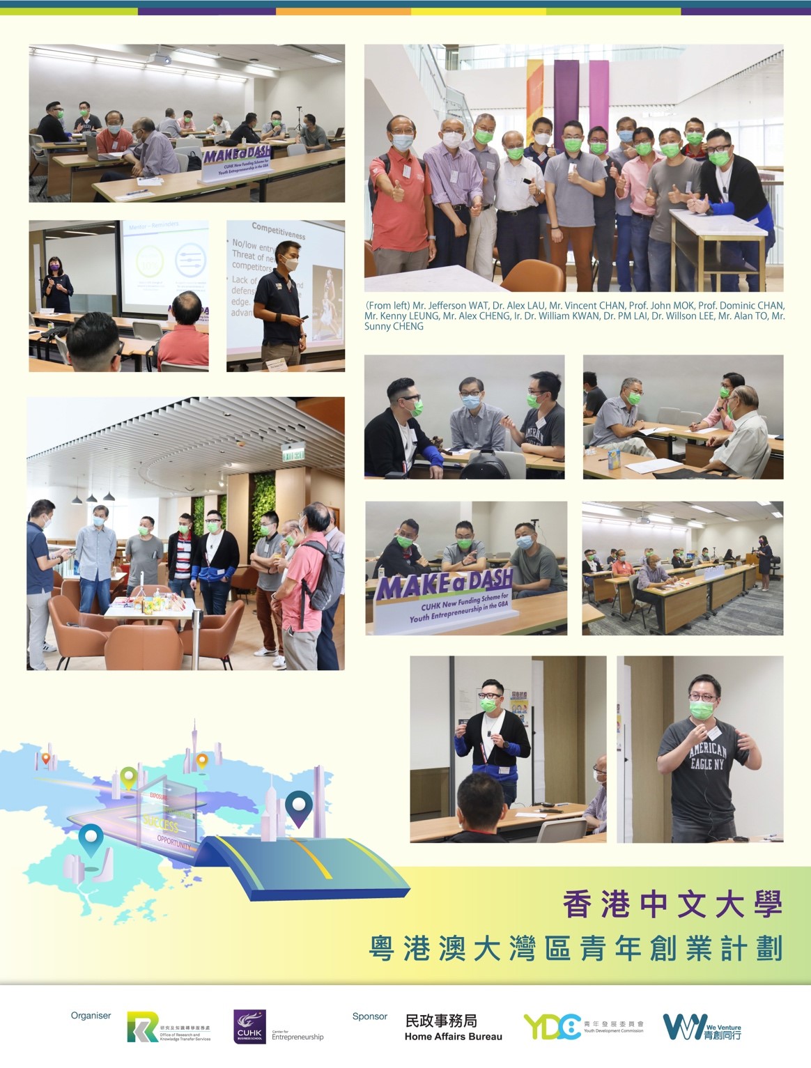 Date: 8 Jul 2021 (Thu) Time: 6:10pm - 9:15pm Venue: UGA, InnoPort, CUHK Format: Face-to-Face Target Participants: “MAKE a DASH” Funded Teams