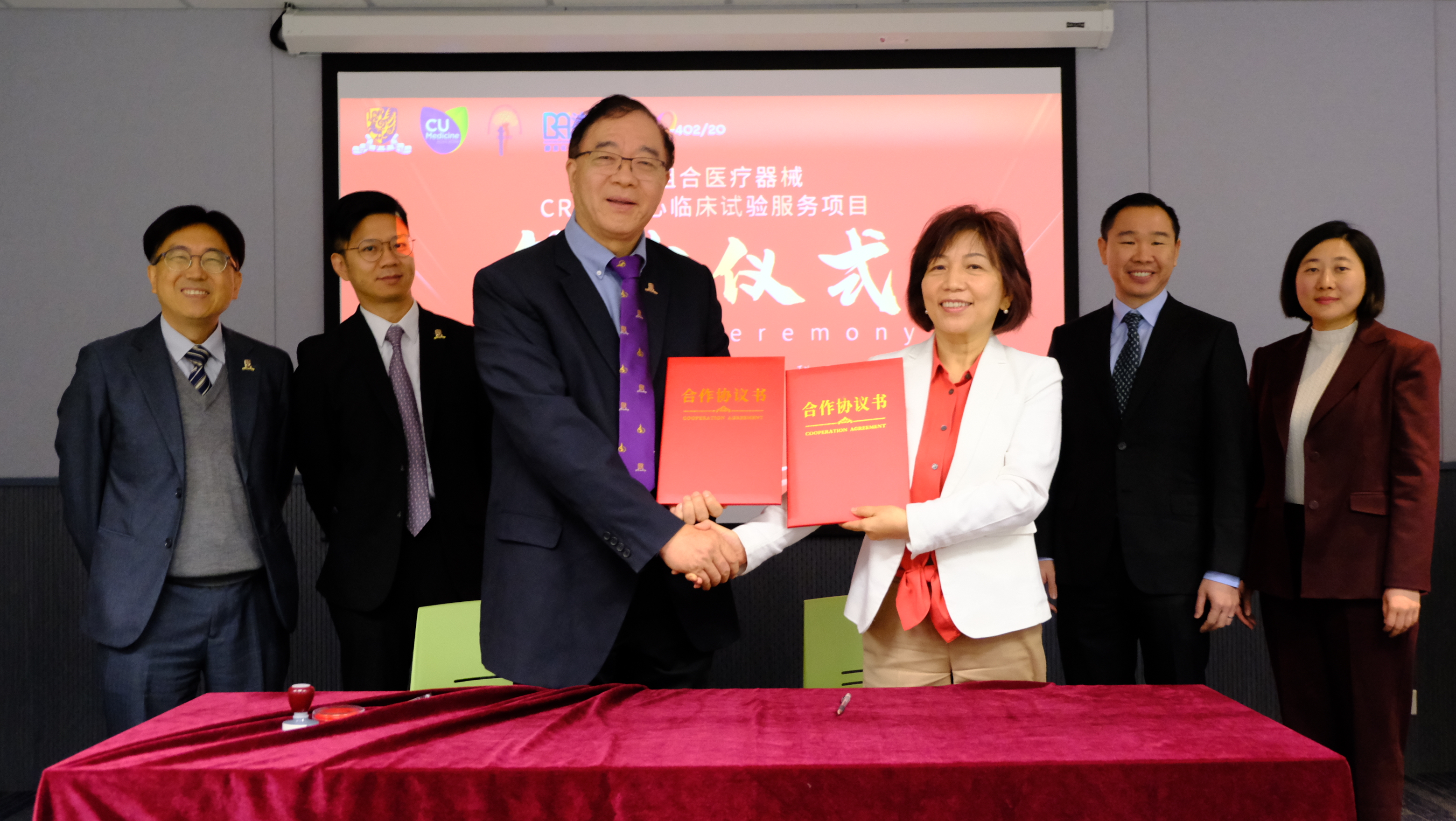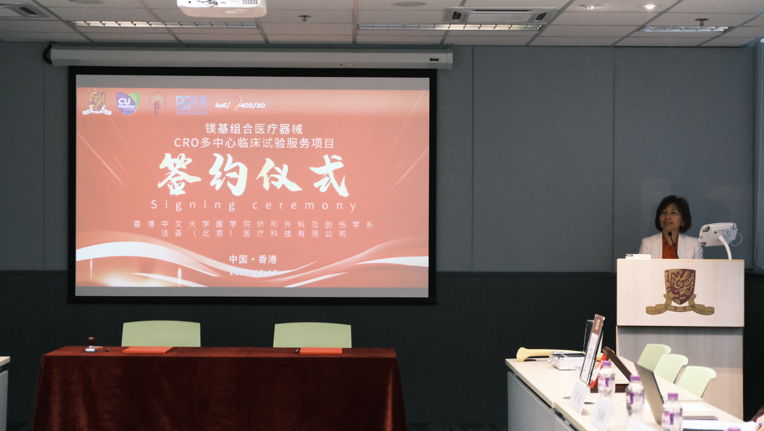 鎂基組合醫療器械CRO多中心臨床試驗服務項目簽約儀式由香港中文大學醫學院矯形外科及創傷學系和實驗室主任秦嶺教授與法薈創始人暨總經理姜雲丹女士共同簽署,並由香港中文大學研究及知識轉移服務處、法薈(北京)醫療科技有限公司及康龍化成共同見證。