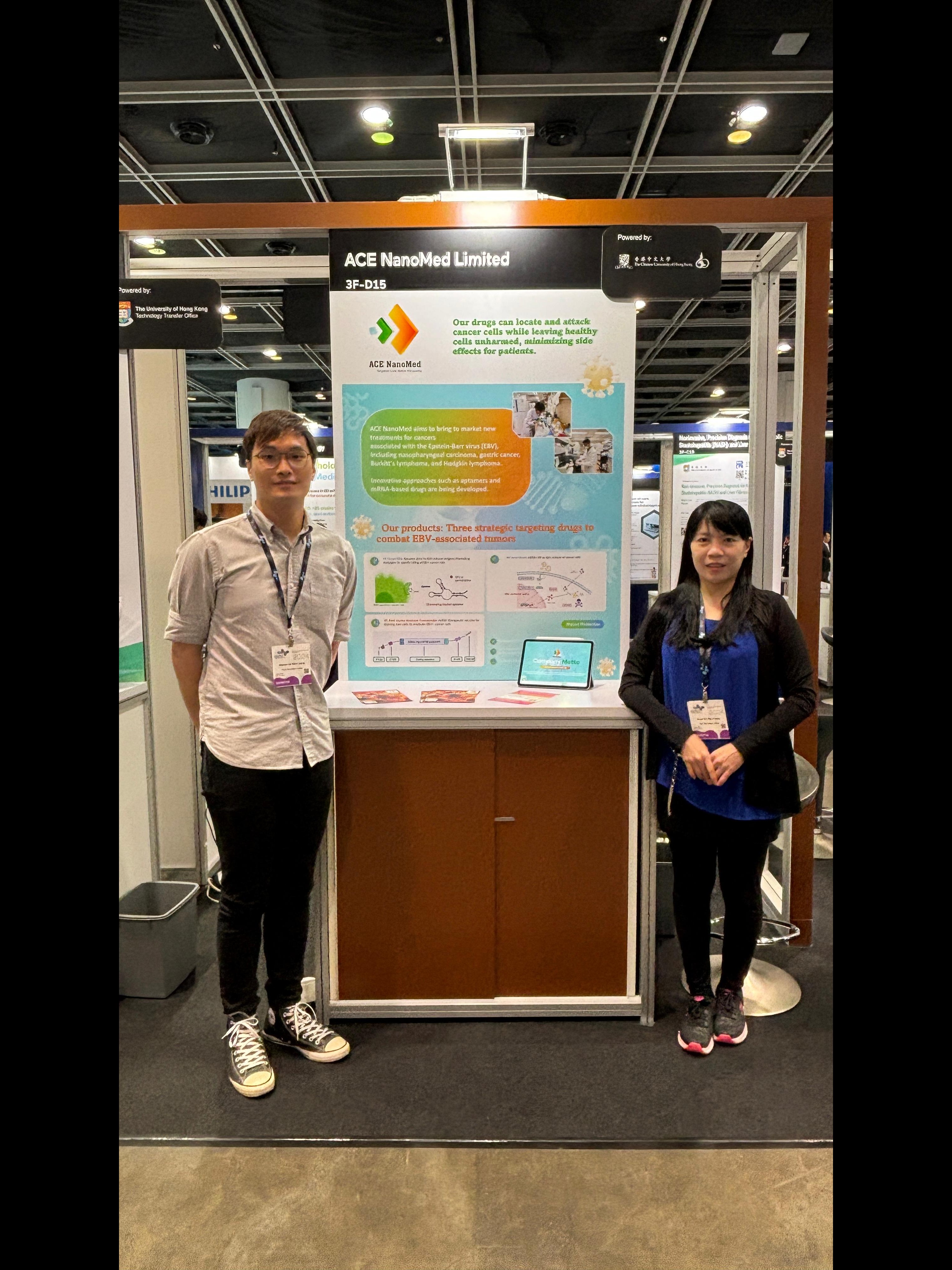A group photo of Prof. Anna TSANG (Department of Anatomical and Cellular Pathology, CUHK; right) with the representative of the ACE NanoMed Limited (under TSSSU scheme). (Photo: ORKTS)