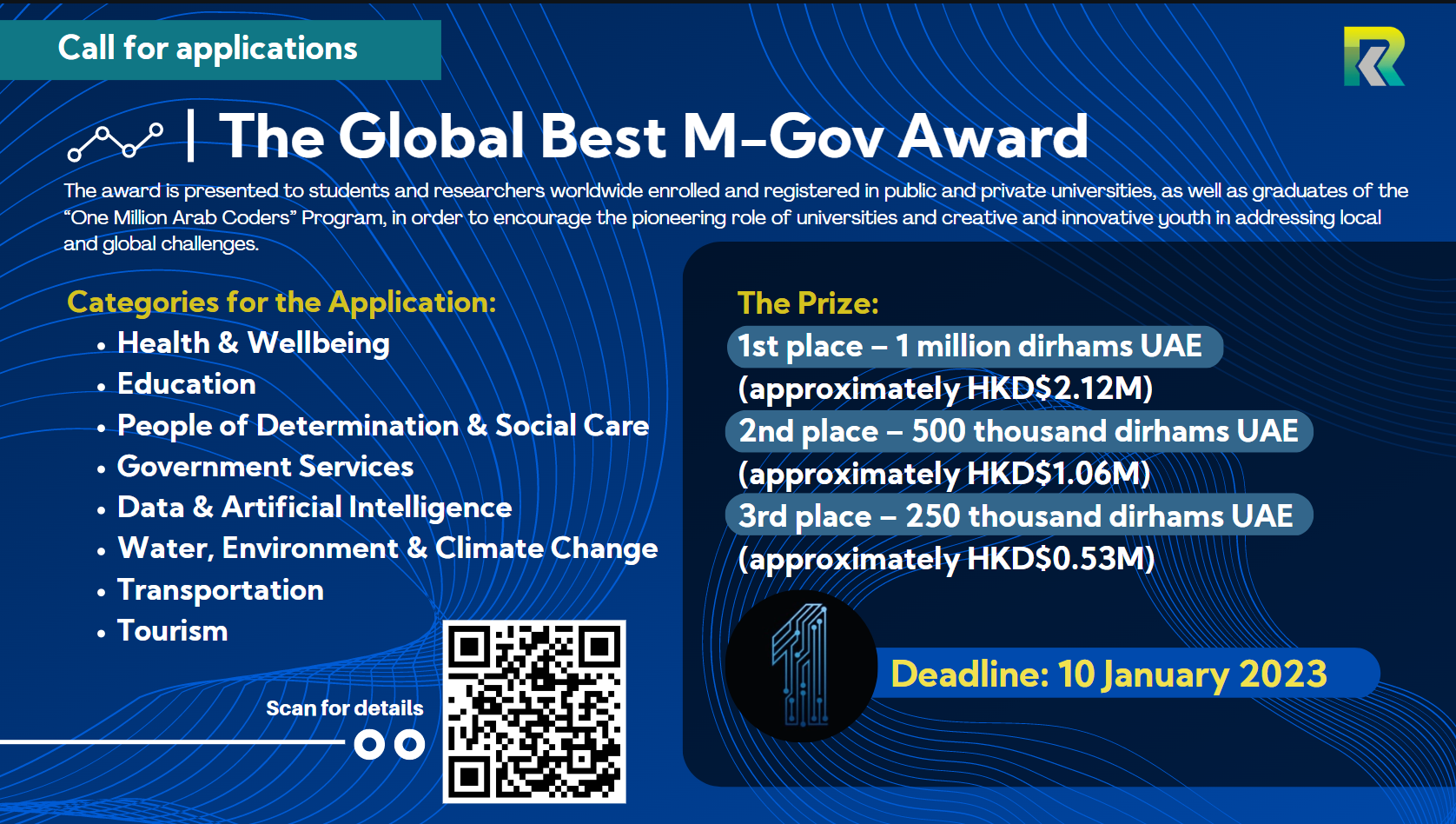 Description of the Call: In its eighth edition, “The Global Best M-Gov Award” is presented to students and researchers worldwide enrolled and registered in public and private universities, as well as graduates of the “One Million Arab Coders” Program, in order to encourage the pioneering role of universities and creative and innovative youth in addressing local and global challenges. The award aims to recognize solutions that adopt novel approaches and techniques in leveraging technology in a streamlined efficient manner to solve sticky problems affecting a large segment of the population and provide tangible benefits with the ability to expand geographically across borders.