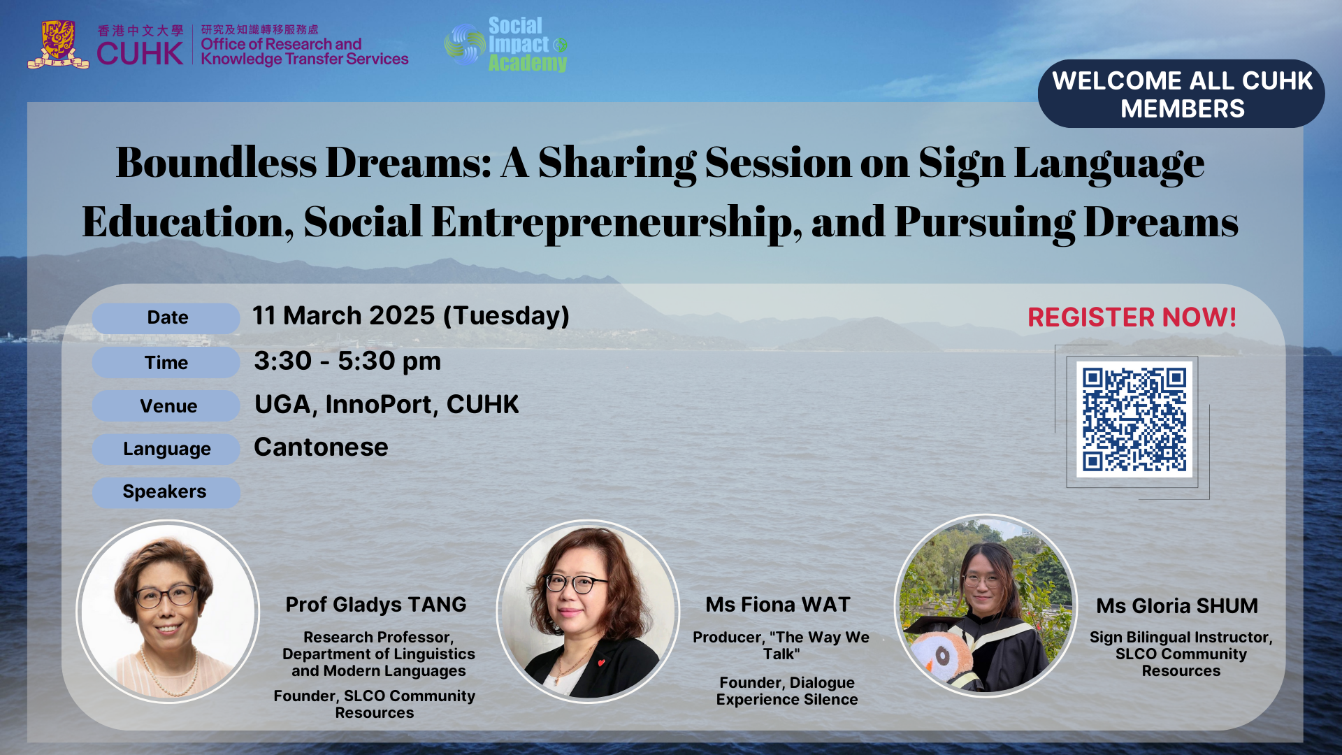 Join us for an interactive sharing and dialogue session showcasing the power of dreams in driving social innovation and inclusion. Learn about Prof. Gladys Tang’s dedication to sign bilingual education and her journey in founding the social enterprise SLCO Community Resources. Gain insight into Ms. Fiona Wat’s vision behind producing the movie The Way We Talk, and explore the inspiring journey of Ms. Gloria Shum, a CUHK Bimodal Bilingual Studies graduate, from learning to practicing sign language.