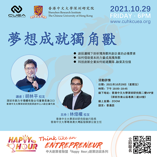中大創業者聯盟「Happy Hour」創業訪談系列第四輪第八場講座由香港中文大學深圳研究院主辦,將於10月29日下午6點開講,此次活動邀請朗力半導體公司董事長兼CEO的胡林平校友,爲衆多創業者就「夢想成就獨角獸」爲主題,以不一樣視角,爲大家分享科技創新企業的組建團隊、融資策略、企業估值等經驗,同時從獨角獸背後的創投邏輯來解讀創業有哪些必備要素,企業如何借助資本的力量成爲獨角獸。 活動採用綫上直播和現場參與兩種方式同步進行,同爲創業者的中大人,歡迎來交流!現場位置有限,先到先得。