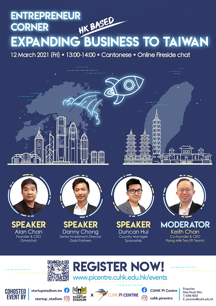 Want to learn from people’s experiences of expanding Hong Kong based businesses to Taiwan? Come along to our upcoming firechat, co-hosted by CUHK PI Centre and Taiwan Startup Stadium, where Mr. Alan Chan, Founder & CEO of Omnichat, Mr. Danny Chong, Senior Investment Director from Gobi Partners and Mr. Duncan Hui, Country Manager of Spaceship will be invited to share their experiences. Don’t miss out!