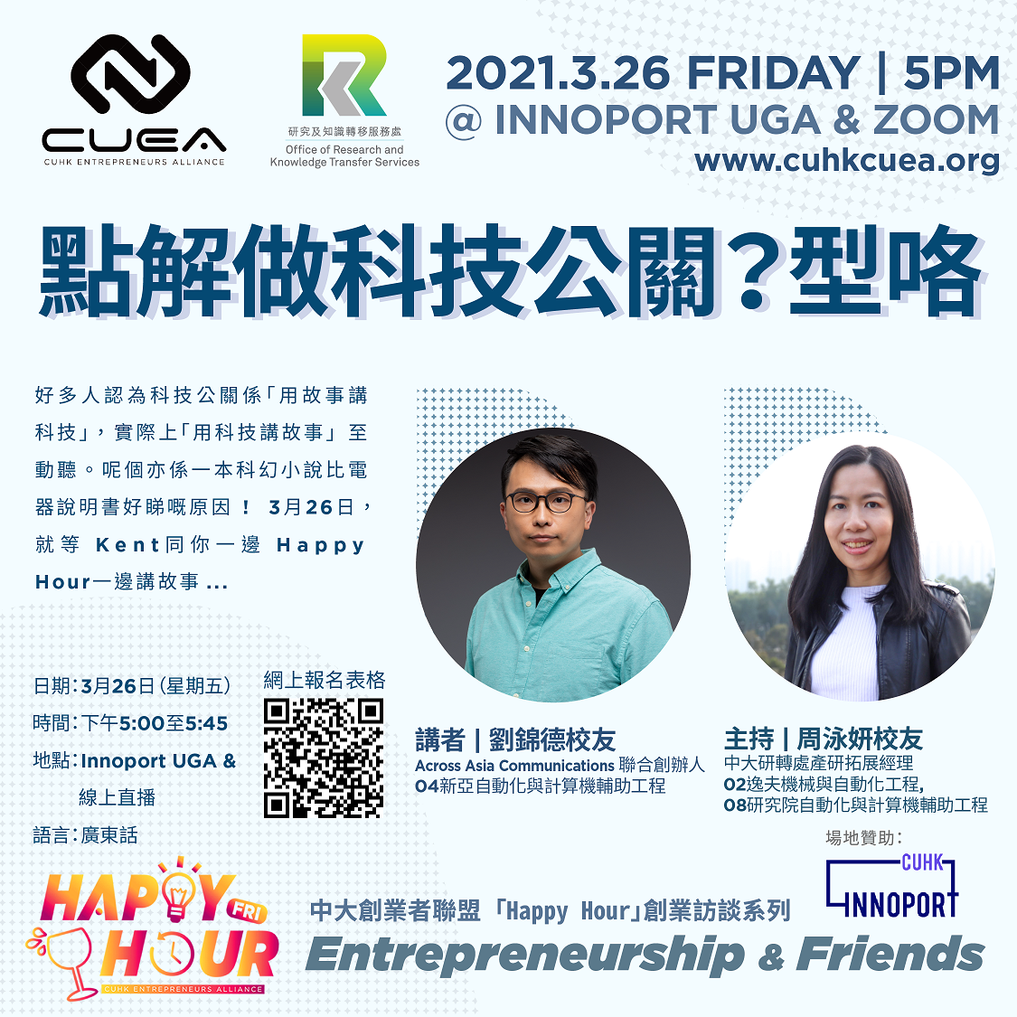 「Happy Hour」創業訪談系列第三輪第二場講座由中大研究及知識轉移服務處安排,邀得Across Asia Communications聯合創辦人劉錦德校友(04新亞自動化與計算機輔助工程)分享《點解做科技公關?型咯》。Kent由一名工程學畢業生,到「貪好玩」創立科技公關公司Across Asia Communications Limited;最近他又嫌在家工作懨悶,更「膽粗粗」於網台和Clubhouse大談科技。3月26日,就讓Kent和你一邊Happy Hour一邊講故事。