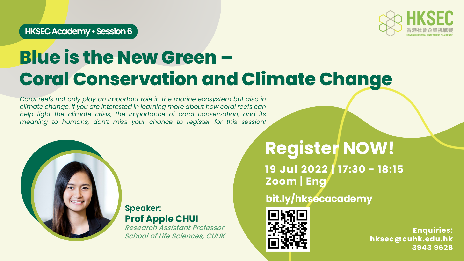 The 6th webinar “Blue is the New Green – Coral Conservation and Climate Change” given by Prof. Apple CHUI, Research Assistant Professor, School of Life Sciences, CUHK, would take place from 17:30 to 18:15 via Zoom on 19 July 2022.