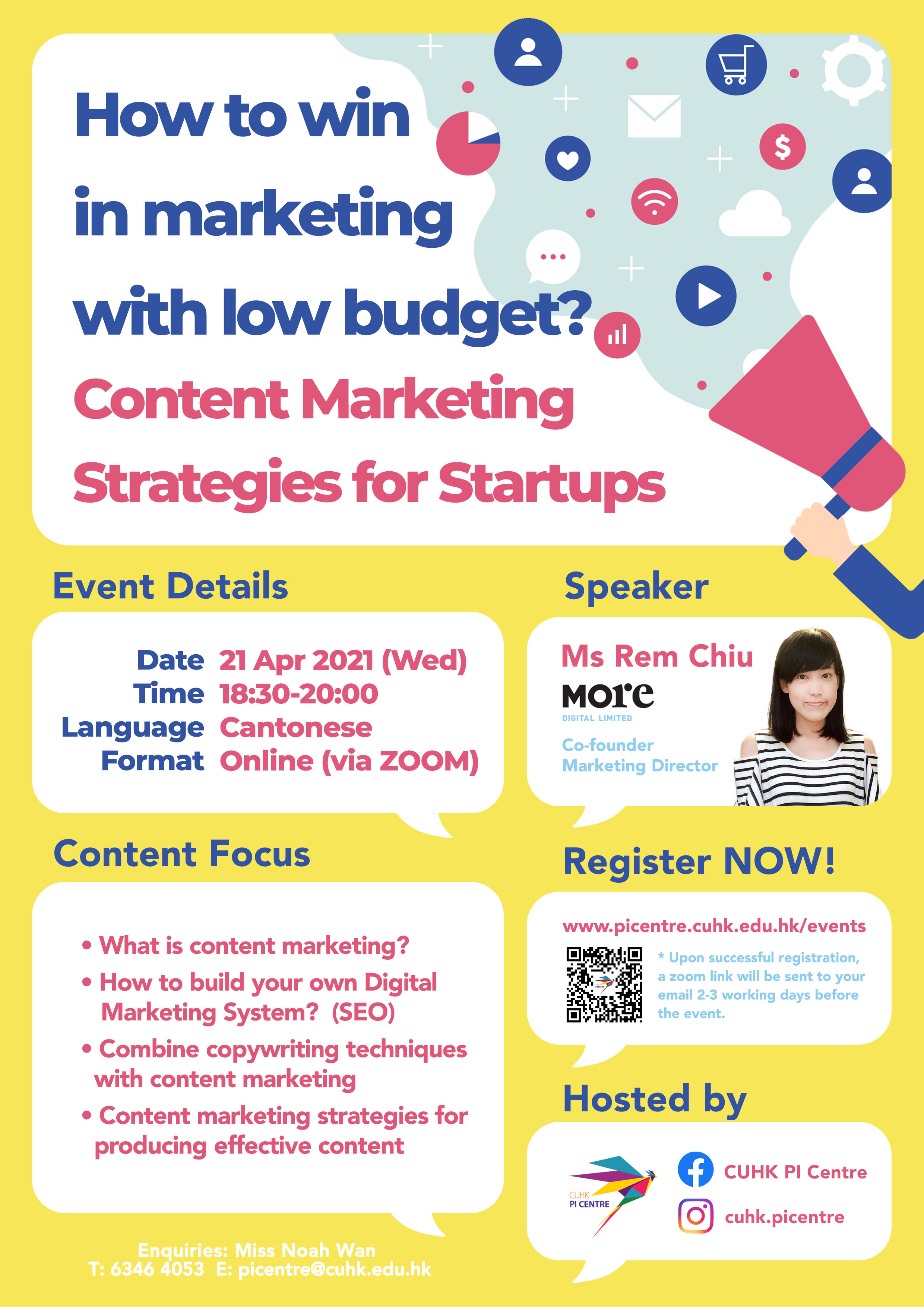 係依個資訊氾濫嘅時代,一間初創企業要突圍而出越來越困難。想知道可以點樣將內容營銷加入你嘅策略營銷計劃裡面,以低預算贏取受眾和客戶?咁就唔好錯過依個webinar啦!