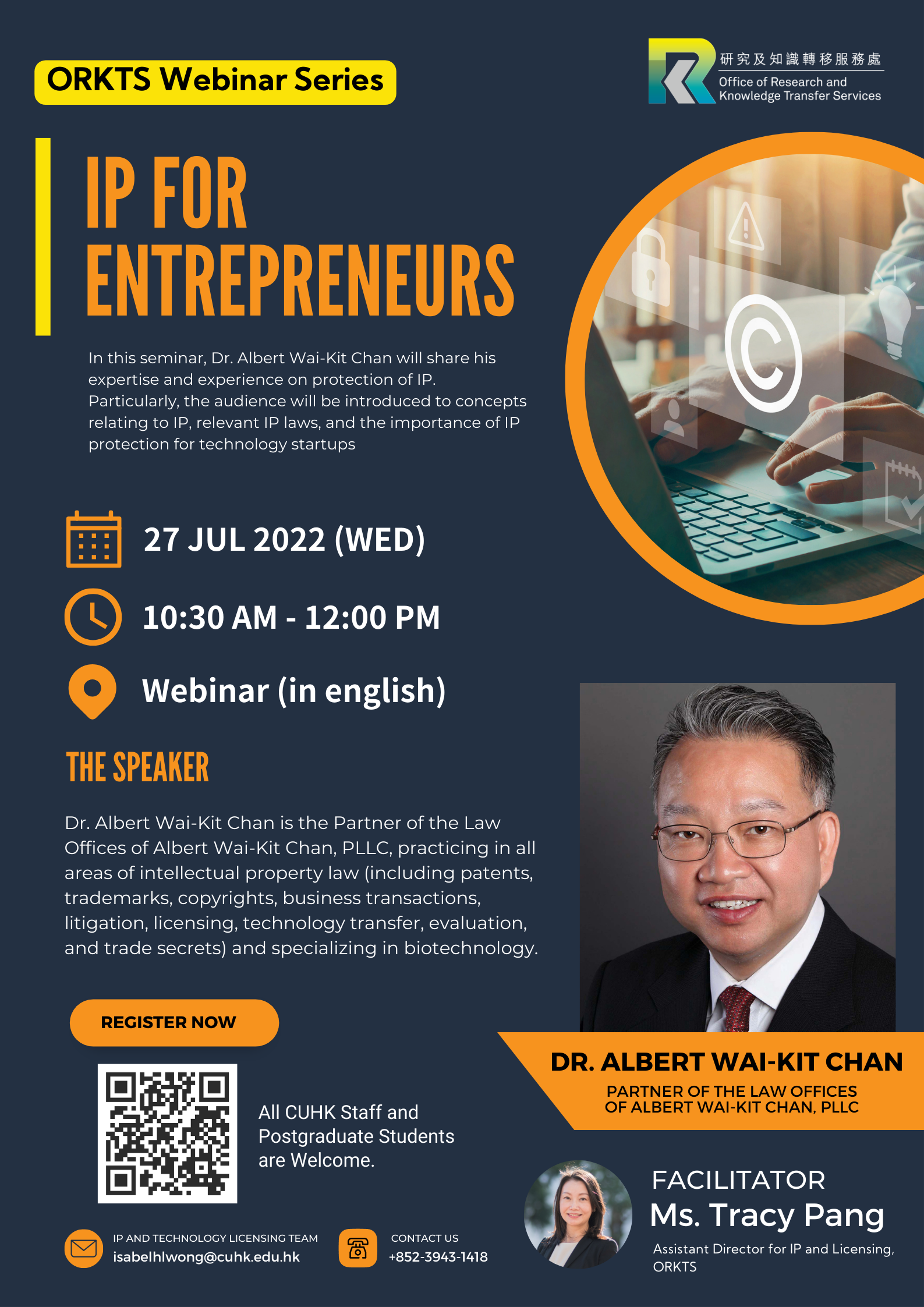 In this seminar, Dr. Albert Wai-Kit Chan will share his expertise and experience on protection of IP. Particularly, the audience will be introduced to concepts relating to IP, relevant IP laws, and the importance of IP protection for technology startups.