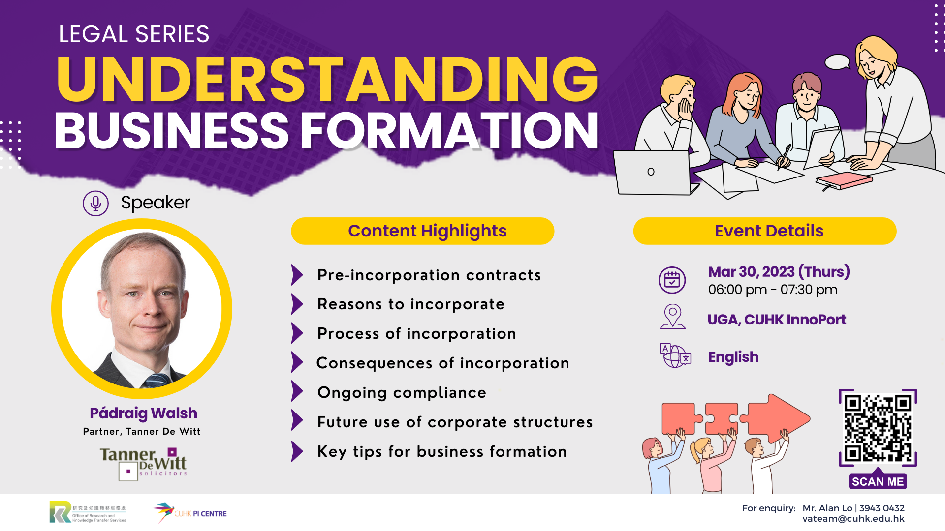 In this session, we are honoured to have Mr. Padraig Walsh sharing about importance of incorporation, process for incorporation and the ongoing compliance with CUHK entrepreneurs and like-minded individuals.