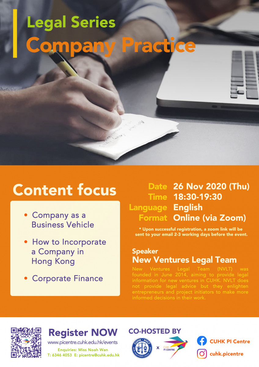 Want to know what the process is for incorporating a company in Hong Kong, and how corporate finance works? Don’t miss out on this webinar cohosted by CUHK New Ventures Legal Team and PI Centre!
