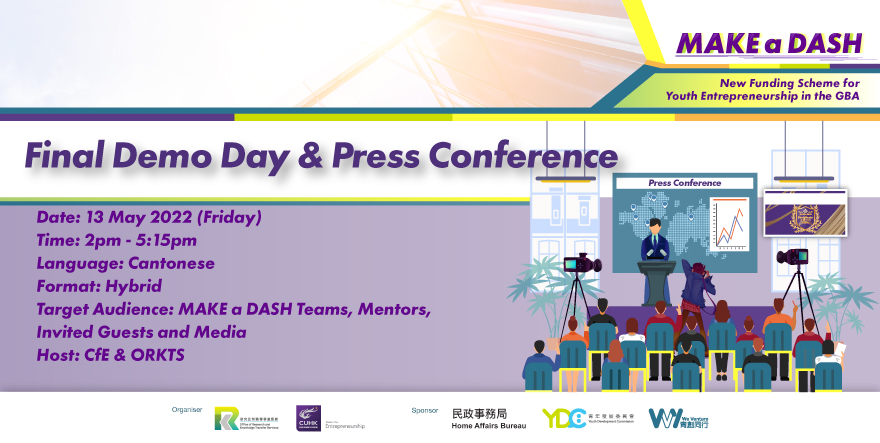 Time flies, the MAKE a DASH (MaD) program under the WeVenture scheme is welcoming a fruitful closure. To mark a full closure of the MAKE a DASH program, MAKE a DASH Final Demo Day & Press Conference will be held on 13 May 2022 (Friday) afternoon. In the press conference, there will be Award Ceremony for outstanding MaD teams and all mentors, giving recognition to our funded start-up teams and showing CUHK’s dedication and support to entrepreneurship development in the GBA.