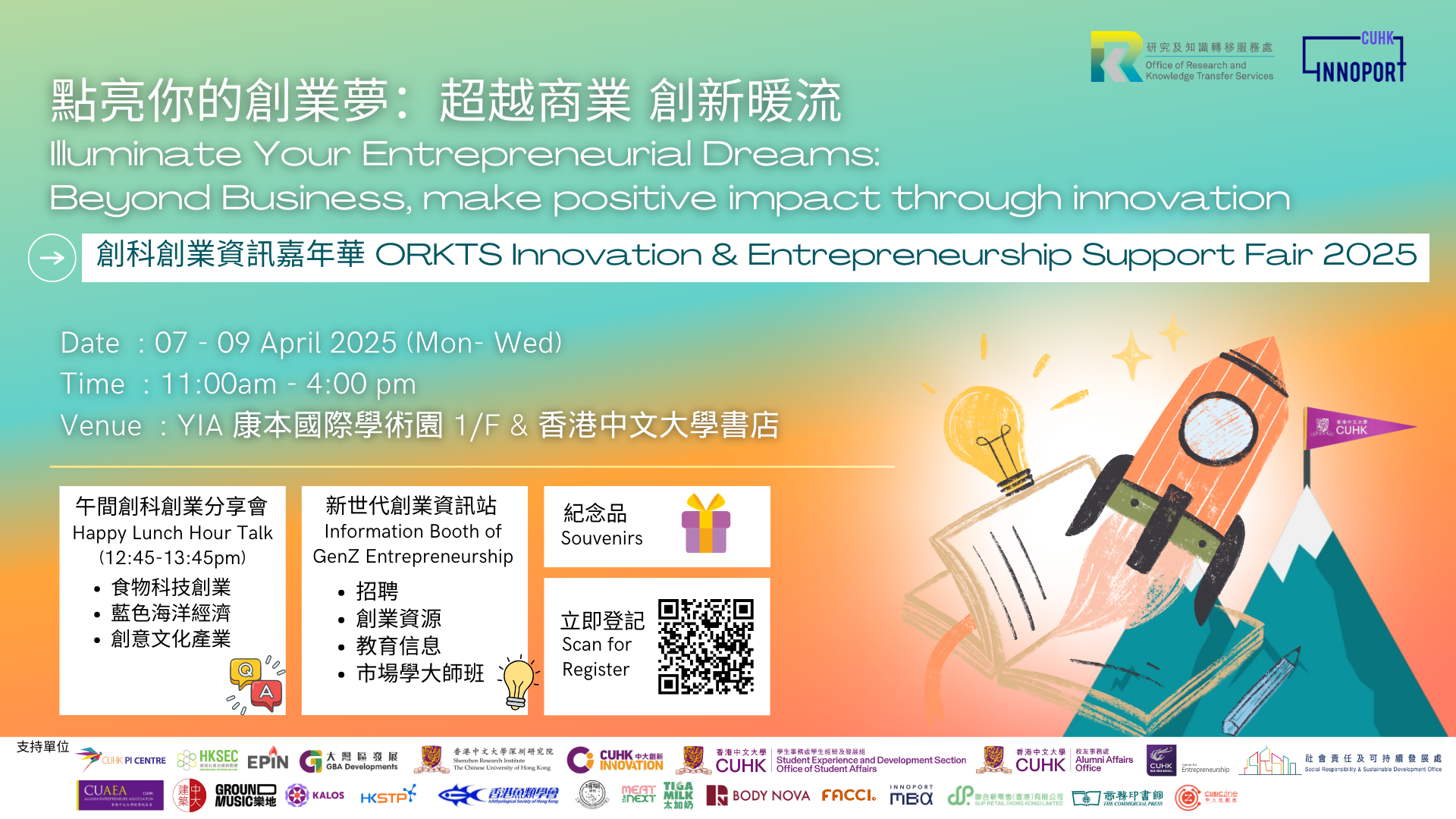 3-days of “ORKTS Entrepreneurship Support Fair 2025” will be held again on April 7-9, 2025, from 11 am to 4 pm at Yasumoto International Academic Park 1/F and YIA CUHK Bookstore!