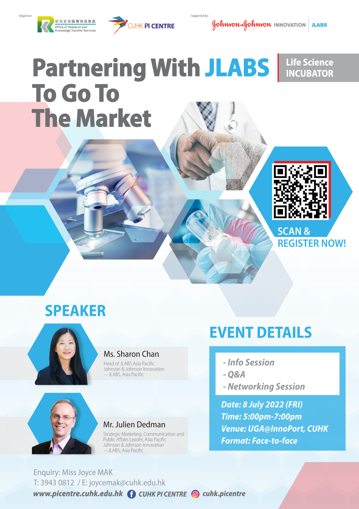 Wonder how JLABS could help your company’s business and product development? This seminar may help! Don’t miss the chance of partnering with life science incubator – JLABS. Come and join us at this upcoming seminar!