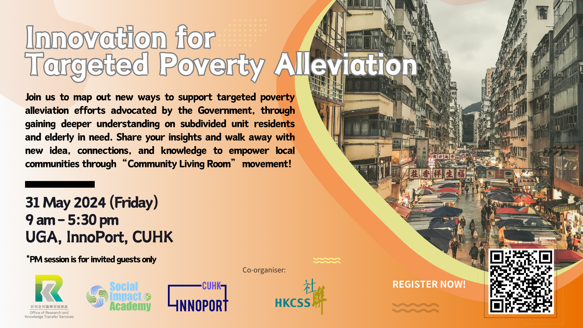 You are cordially invited to join our event Innovation for Targeted Poverty Alleviation to learn from experienced NGO leaders and CUHK professors leveraging Community Living Room and related service as a platform to serve the communities in need.
