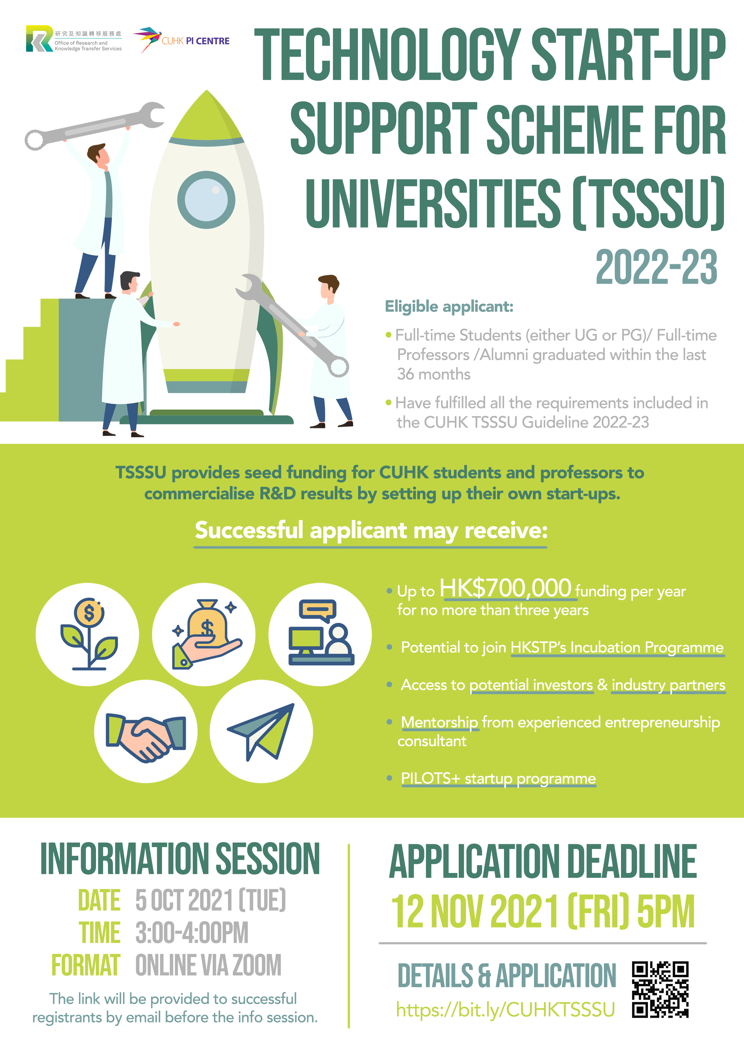 The Innovation and Technology Commission (ITC) of the Hong Kong SAR Government has set up Technology Start-up Support Scheme for Universities (TSSSU) to encourage students, professors, and alumni from six local universities, including CUHK, to start their own technology companies to commercialize R&D results.