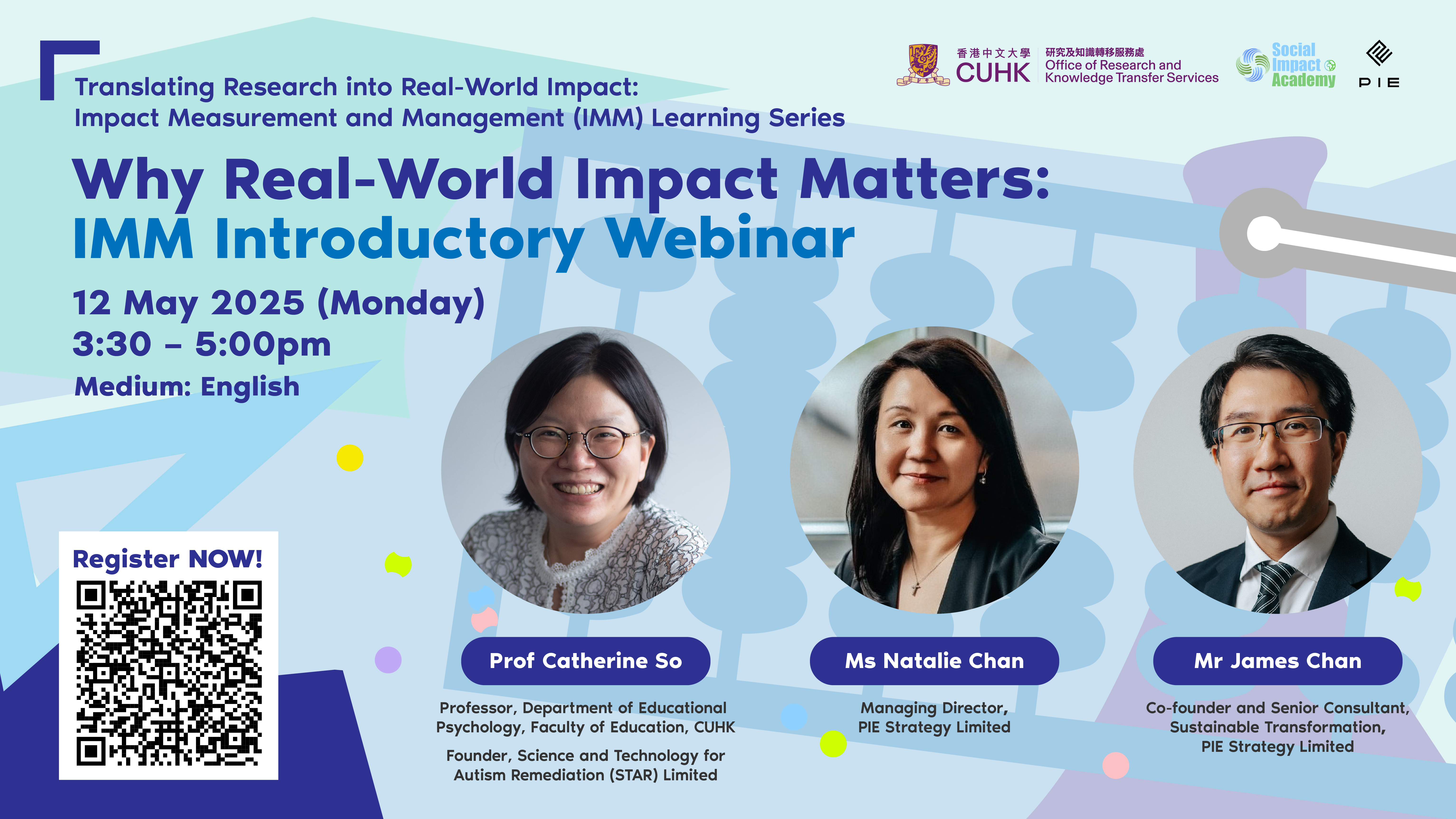 ORKTS is thrilled to launch the Translating Research into Real-World Impact: Impact Measurement and Management (IMM) Learning Series. This programme connects research, teaching, and community engagement to the world’s most urgent social and environmental challenges, empowering CUHK members with practical tools to measure and manage project impact. By exploring IMM and key frameworks such as the UNDP Sustainable Development Goal (SDG) Impact Standards, participants will enhance their proficiency, elevate impact evidence for Research Assessment Exercise (RAE) submissions, and foster sustainable social impact.