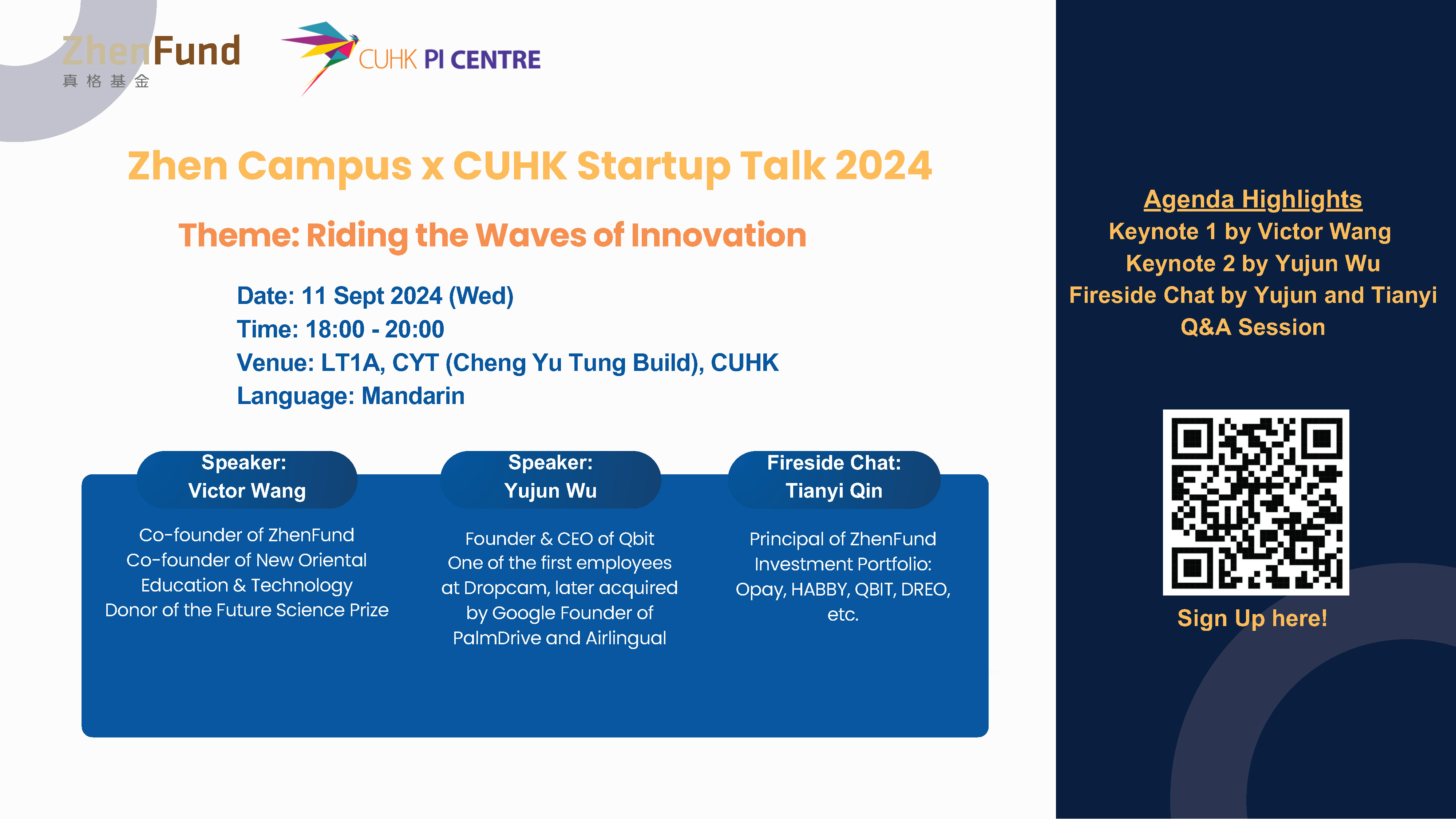ZhenFund x PI Centre Startup Talk- [Riding the Waves of Innovation will be held on Sept 11, 2024 (Wed) 6:00- 8:00pm at LT1A, CYT (Cheng Yu Tung Building), CUHK.