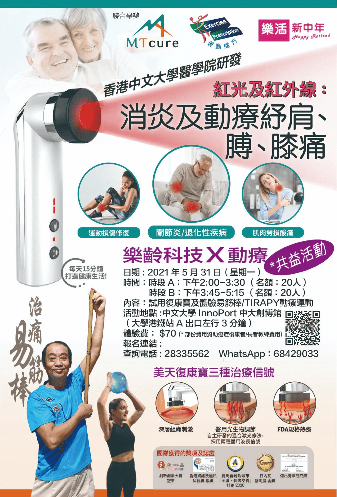 透過讓長者體驗試用由香港中文大學醫學院團隊MTcure研發的美天復康寶、參與易筋棒和TIRAPY動療這三種活動, 藉此宣傳和推廣樂齡復康科技結合動療的信息,共建齡活長者友善城市,同時改善他們肌骨關節的退化性疾病,特別是舒緩肩膊和膝關節疼痛。